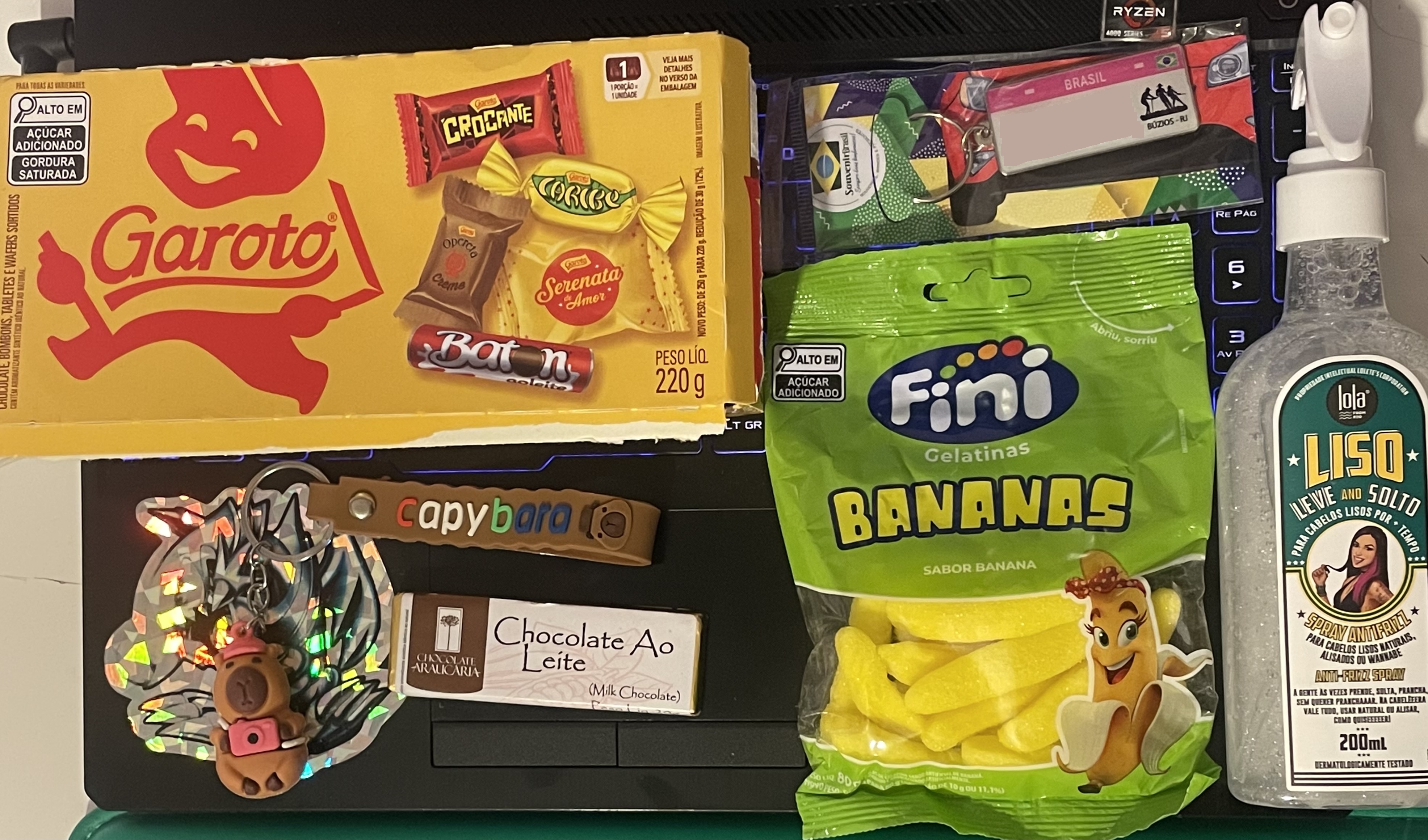 Esta vez me trajeron cositas de Brasil. Si no lo habían notado, tengo el paladar muy dulce y me encantan este tipo de cosas, incluso me doy el permiso de comer las gomitas aunque sean de gelatina (cerdito), porque el sabor de plátano es muy bueno. Me llaman la atención los sellos ("ALTO EM"), pensar que eso nació aquí y de ahí se esparció por el mundo, algo de orgullo chileno, aunque sea para recordarte que no es saludable. Me acuerdo de por ahí tendré una añeja selfie del 2016 o 2017, cuando la ley recién había sido oficializada y los sellos eran stickers, tenía una capa de como 7 stickers de los sellos grandes, esos que eran 3 o 4 advertencias hexagonales, pegada en el reverso del celular. Qué tiempos.